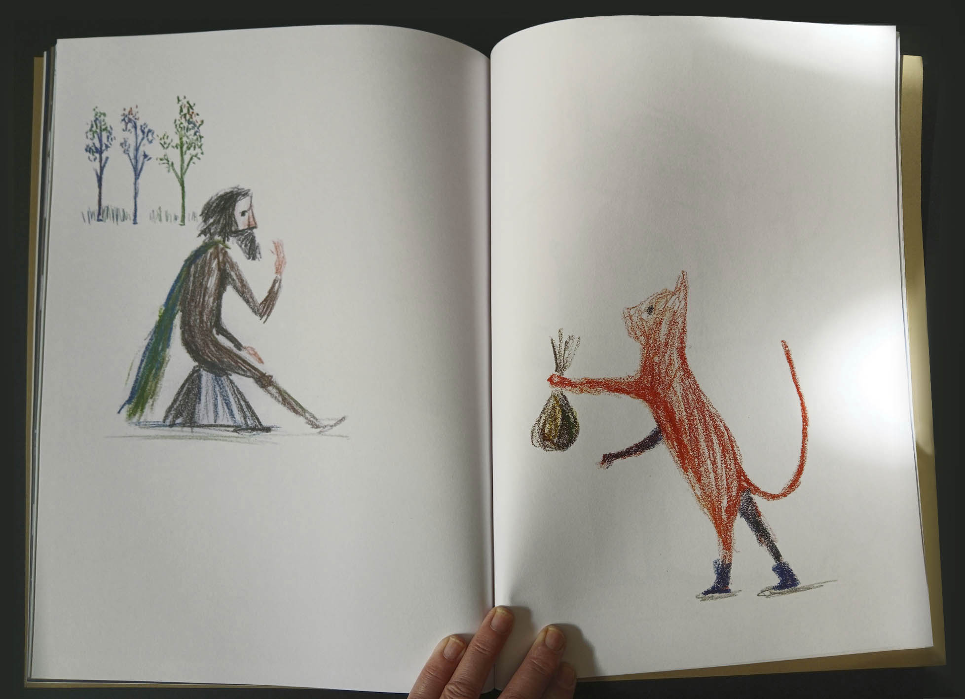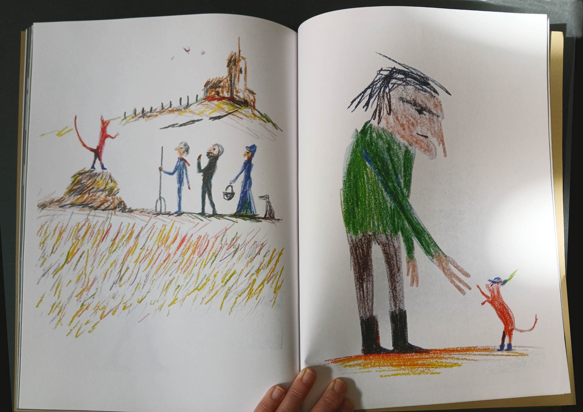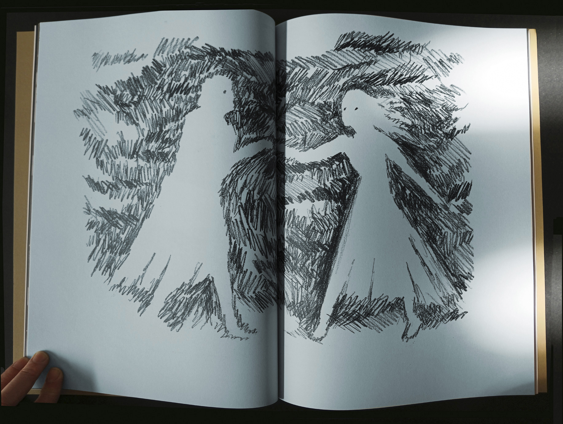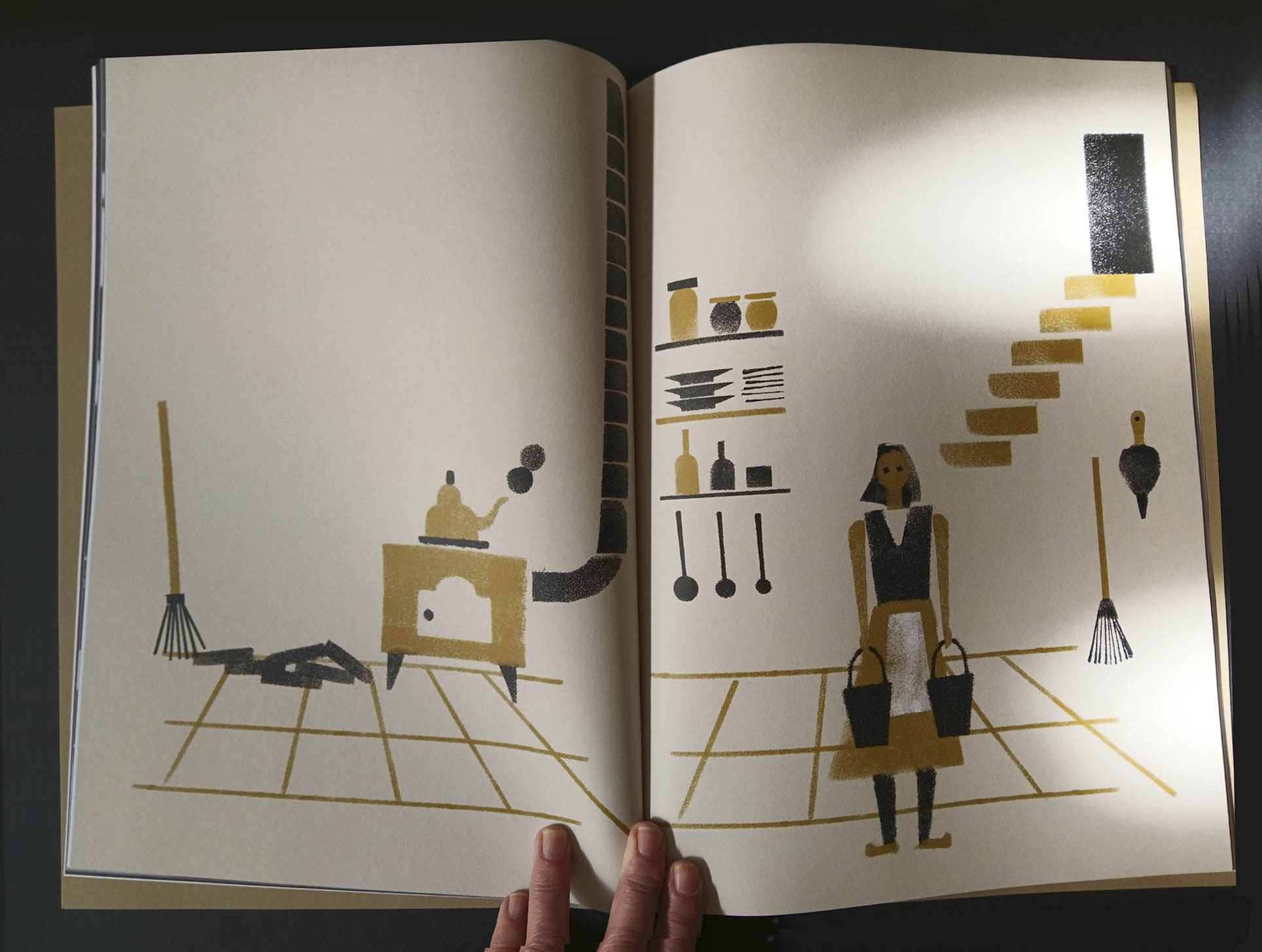 Este libro de imágenes está concebido para ser contado oralmente mientras se muestran sus ilustraciones y evoca algunos de los cuentos de “Mama Ganso”, también conocidos como “Cuentos de Mamá Oca” o “Cuentos del tiempo pasado”, compilados por Charles Perrault en 1697; aunque la versión original constaba de nueve relatos, en esta edición se incluyen Caperucita Roja, Las Hadas, Cenicienta, Barba Azul, El Gato con Botas y Piel de Asno. Se trata de un libro de gran formato (280 x 390 mm), impreso en papel mate de alta calidad Arena Rough de Fedrigoni, en el que cada cuento está ilustrado con un estilo distinto, grafito, collage, lápices de colores, estampación o escenarios de cartón. Ilustrar estos cuentos ha supuesto para nosotros un intenso trabajo de investigación, bocetos y pruebas, y sobre todo el reto de reinterpretar visualmente relatos clásicos que ya fueron ilustrados por grandes artistas que son referencia e inspiración, como Gustave Doré, Arthur Rackham, Wanda Zeigner, Kay Nielsen, Einar Neiman, Herbert Leupin, Takeo Takei o Bartolozzi. Nuestra propuesta reinterpreta pasajes que se han convertido en símbolos desde los grabados de Doré realizados en 1867, sin olvidar que ya en la primera edición de 1697 aparecieron ilustraciones de Antoine Clouzier, que muy probablemente influyeron en el propio Doré.